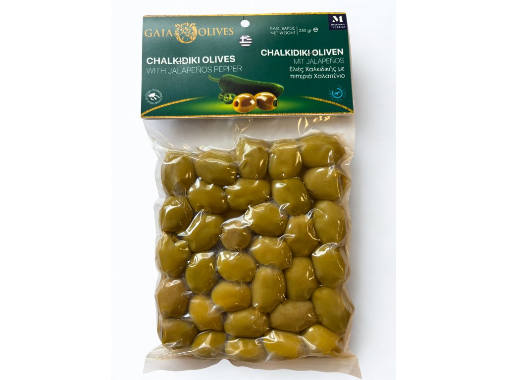Složení: zelené olivy Chalkidiki, papriky Jalapeňo, voda, mořská sůl,