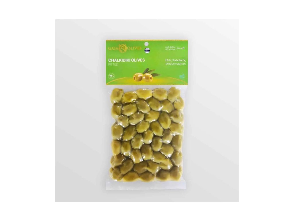 Složení: zelené olivy Chalkidiki, voda, mořská sůl, kyselina